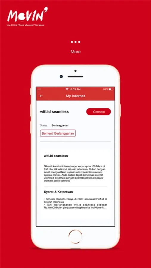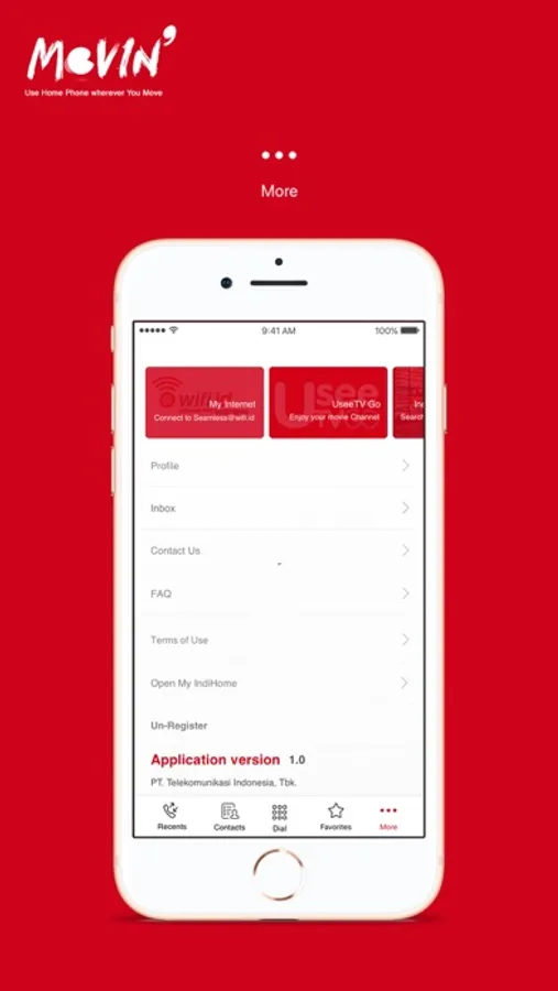 Melalui Movin', IndiHome Quad-Play menghadirkan Broadband Internet (WiFi), Televisi, Telepon - rumah & mobile (Smartphone anda) ke dalam rumah Anda. Movin' adalah aplikasi mobile yang diperkaya dengan semua fitur yang ada. Dengan rancangan yang serius & intuitif. Movin’ Phone memungkinkan Anda untuk melakukan dan menerima panggilan dari smartphone menggunakan nomor telepon rumah di dalam jaringan IndiHome Anda. Biaya tagihan akan dimasukkan ke dalam tagihan IndiHome. Saat mengaktifkan Movin', Anda akan mendapatkan nomor telepon baru yang berbeda dengan nomor telepon rumah IndiHome.