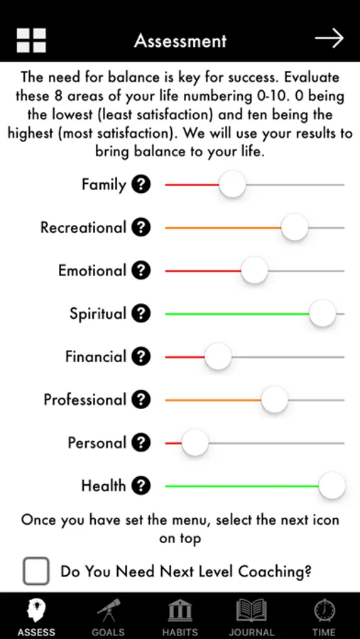 Follow the initial instructions to assess your current state and performance in eight areas. Based upon your assessment you will be able to set goals and new habits for success. Barrier Buster will help you develop habits and skills necessary for success over the 90 days. Each day you open the app it will launch the "Time management" section. This section will help you manage yourself, resulting in you having your desired result.