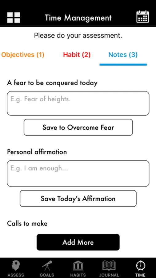 You will see four tabs (Objectives, Habits, Notes, Focus) that will guide you into higher performance everyday. You will be strengthened, motivated, and focused like never before.