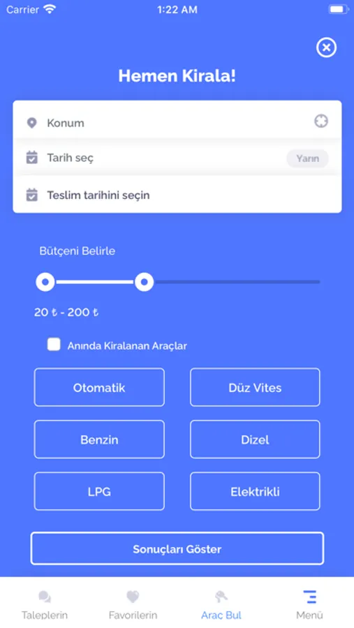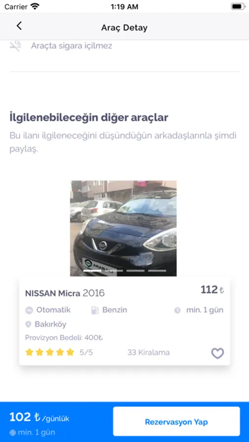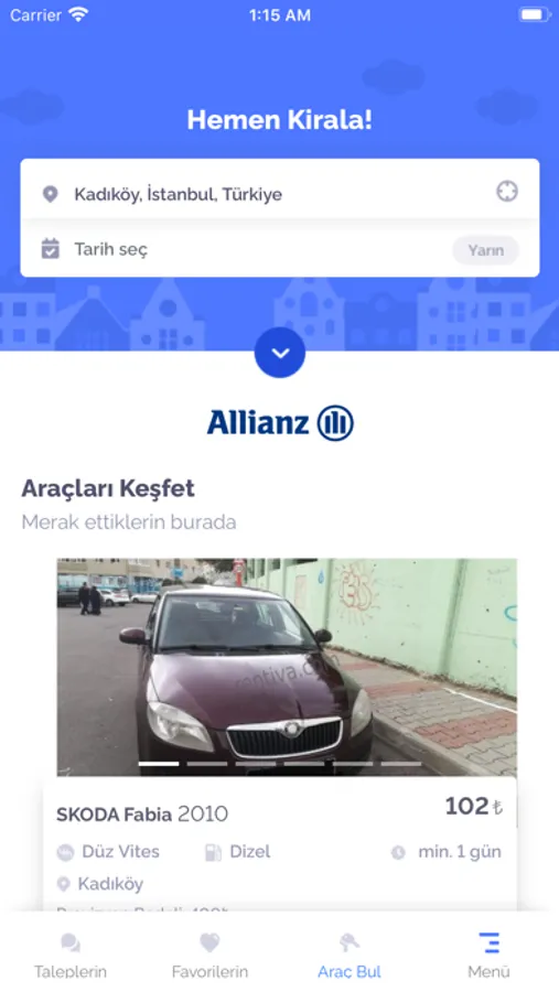 • Çeşitli konumlardaki araçları görüntüleyin, müsait olduğu tarihleri kontrol edin ve size en uygun olanını seçtikten sonra araç sahibine uygulama üzerinden kiralama talebi gönderin.
