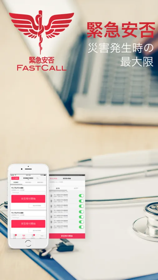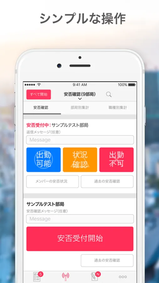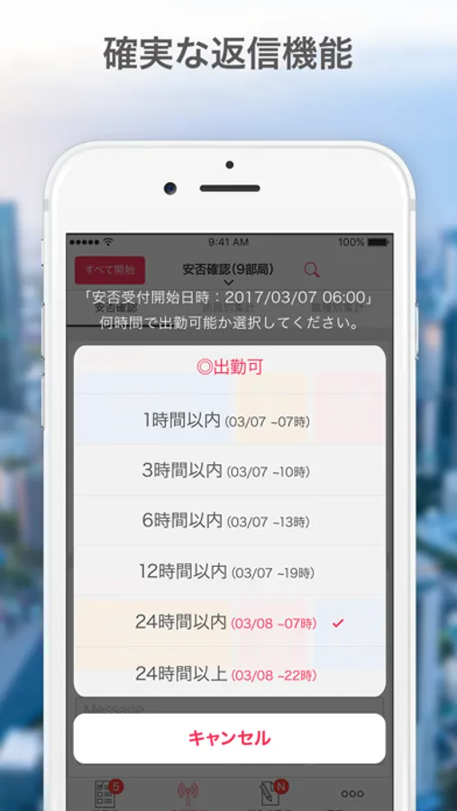 シンプル操作にこだわった安否確認システム。安否確認発令時、確認の返答はボタンを押すだけで完了します。厚生労働省BCP対策マニュアルに準拠し、無事(出勤可能)の場合、何時間以内に出勤可能かの確認も一度に行えるため、緊急対応時に招集可能人数まで把握が可能となります。