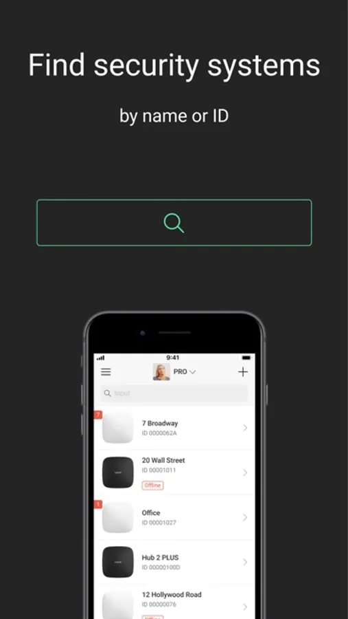 The app allows you to administer an unlimited number of security systems. Ajax PRO helps you monitor the state of systems, adjust their settings, and manage user access rights. Both from the company and personal accounts.