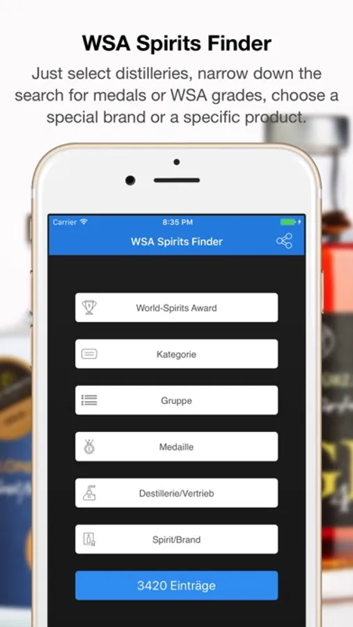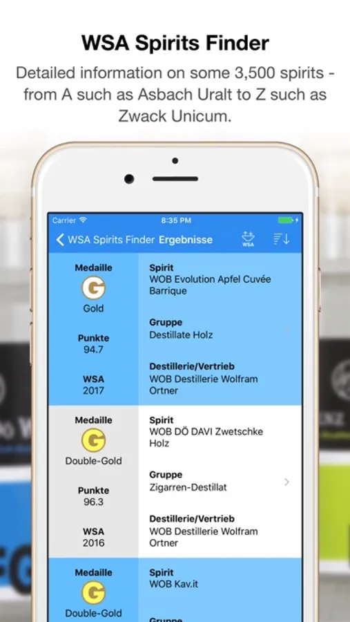 The World Spirits Award is known amongst experts as being the highest quality spirits award in the world. You now have the possibility to access the results directly, all the way back to 2008, using the WSA Spirits Finder. The WSA app (in German and English) has the following functions, which are available free of charge: