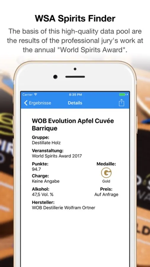Detailed information on the approx. 3,500 spirits – from A for Asbach Uralt to Z for Zwack Unicum: producers around the globe, from manufacture to industry (with direct links to the websites), products ranging from absinthe, Armagnac and Moutai to tequila and plum distillates (some with photos). You can select distilleries, restrict your search to medals or WSA years, choose a special brand or a special product, and much more. The basis for this high quality data pool are the results of the professional jury at the annual World Spirits Award. The app also includes verbal descriptions of brand-name products and the exact number of points they received (maximum 100 WOB points), and thus offers profound information on the price/performance ratio.