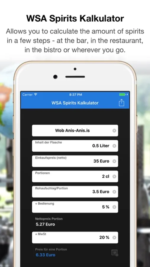The Spirits Calculator is primarily designed for the catering and hotel sector, but can also be used by private individuals and professionals to calculate prices. It is basically a pocket calculator with modern technology and functions, which, in just a few steps, enables the calculation of spirits per portion – at the bar, in the restaurant, in the café or wherever else you might be. It doesn’t matter in which country you want to calculate your spirits – this service tool includes all the important parameters. The core function is the absolute calculation and not the percentage calculation of spirits. You can also enter the net income per portion and in doing so, as well as the costs such as service charges and VAT, you can also receive a customer-friendly price, which you can also print.