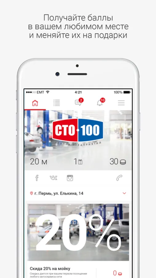 - получать бонусы в размере от 10% при покупке каждой услуге в любом предприятии СТО-100