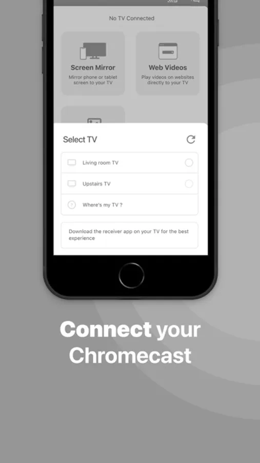 2. Launch the Mirror for Chromecast app. It will start looking for your Chromecast devices on your local network. When a Chromecast is found, please select it.