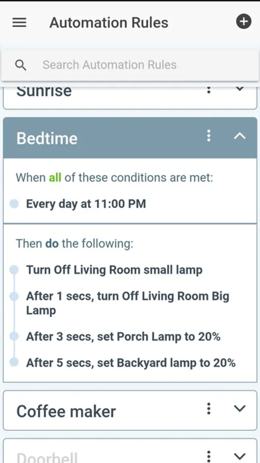 · Create Automation rules that simplify your life. For example, lights can be turned on automatically at sunset