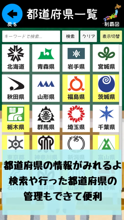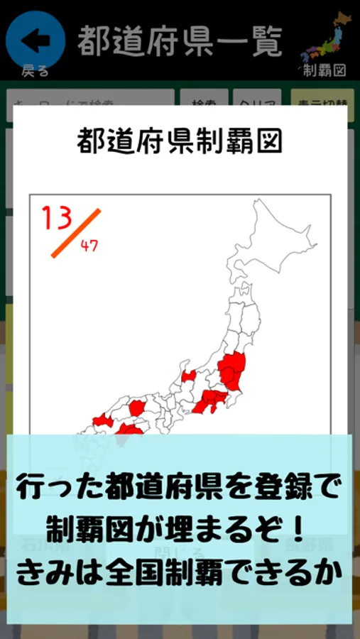 ※行った都道府県は一覧で黄色く表示されて、制覇図でもみれるよ!