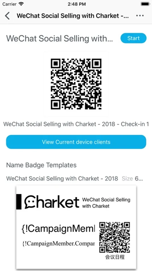 Charket connects your Salesforce org to manage events. With Charket, you can create an event base on a campaign and show a QR code to your attendees who can scan the QR code to check in the event and print the badge.