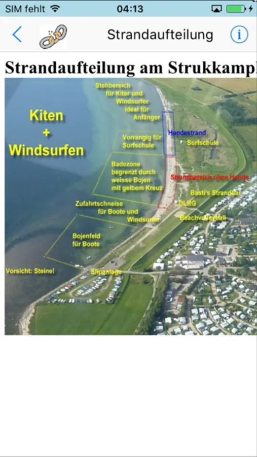 - Strandübersicht: Badezone, Hundestrand, Bereich für Kiter und Surfer...