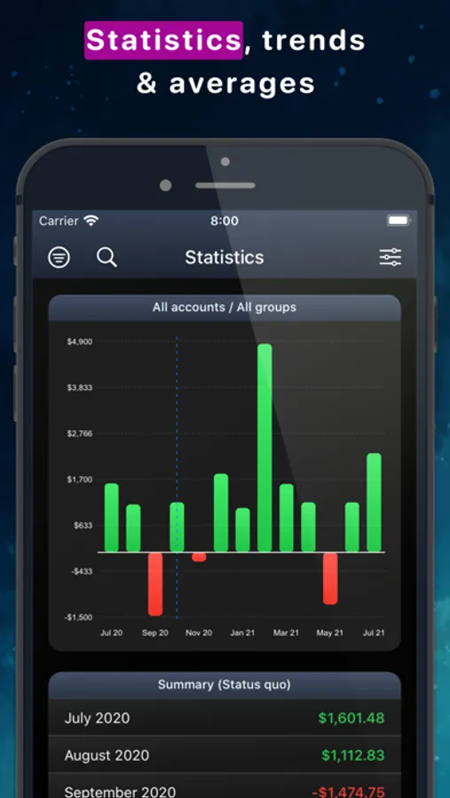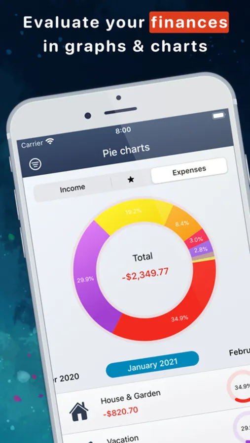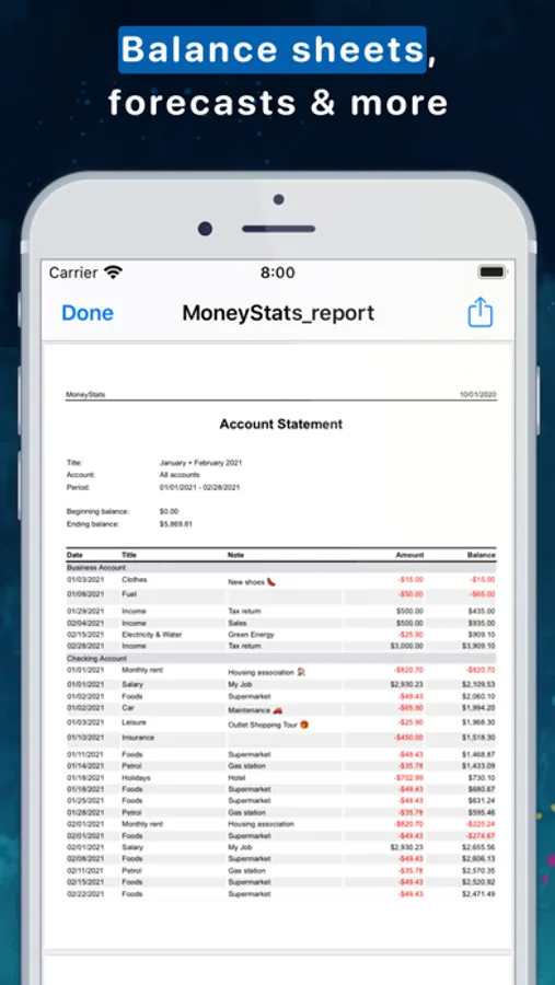 With MoneyStats you have full control of your personal finances, your budget and your income and expenses! Create financial overviews, evaluate, track and manage your money! Keep an eye on your budget, manage your money and various bank accounts, categorize expenditures, discover new ways to save money, load current and historical exchange rates, manage your finances on different devices, automatically group your transactions, create recurring income and expenses, import from external data sources such as CSV-files and analyze your current and future finances! MoneyStats is more than just a money app!