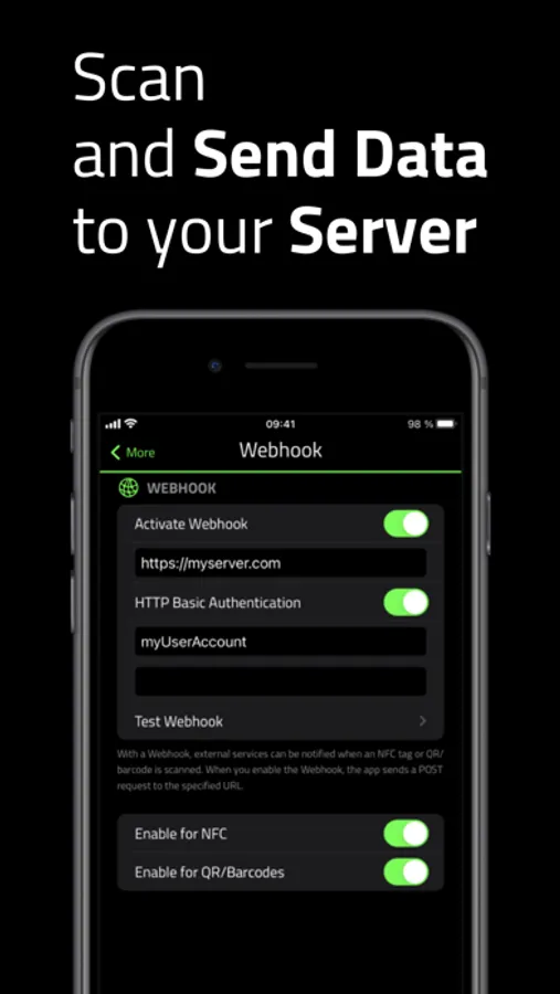 Send scanned NFC and QR data to your server with security and flexibility. Ideal for warehousing, inventory, membership systems, and home automation possibilities.