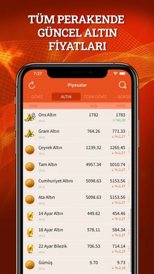- Satışta olan altın türlerinin serbest piyasa ve banka banka alım satım fiyatlarini ve günlük değişim grafiklerini takip edebilirsiniz.