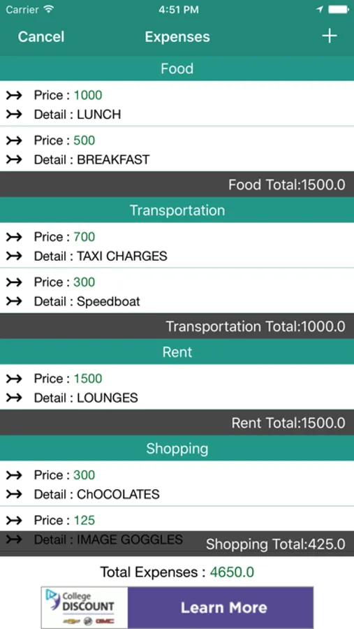 - Add and track expenses (food, transportations, shopping, rent and other expenses).