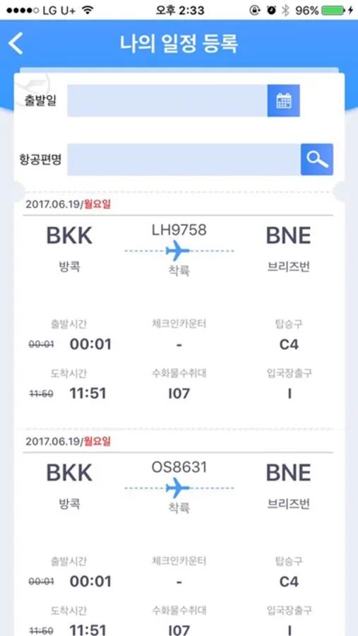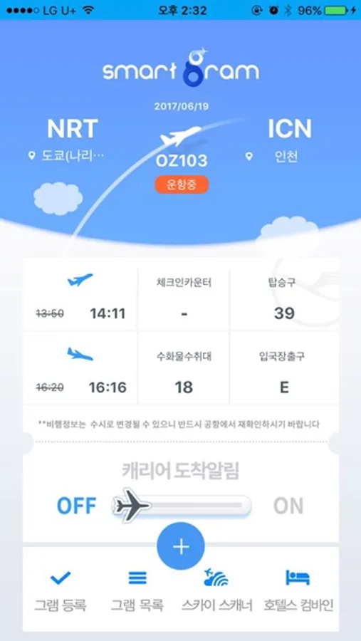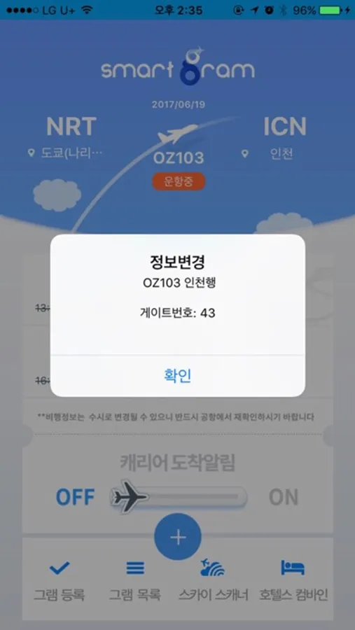 3. 공항의 출발편 및 도착편 항공편을 등록하시면, 출발 및 도착시간, 체크인카운터, 탑승구, 수화물수취대, 입국장출구 등의 변경사항이 있으면 변경사항을 알려줍니다.