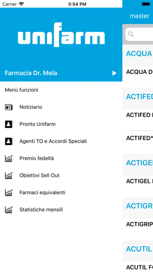 L'App consente di visualizzare sul proprio dispositivo le notizie Unifarm aggiornate, la rubrica telefonica di Unifarm e dei rappresentanti di zona, varie statistiche utili alla Farmacia (fedeltà, fatturati, progetto sell-out, etc.).