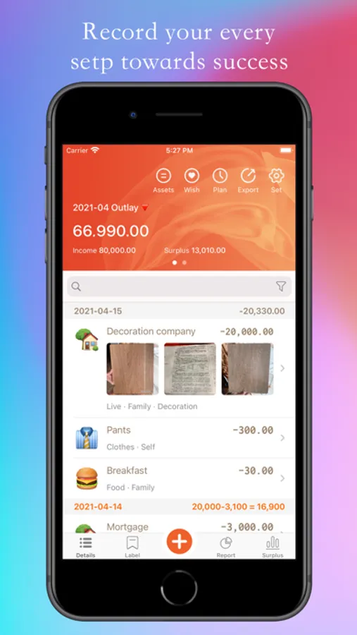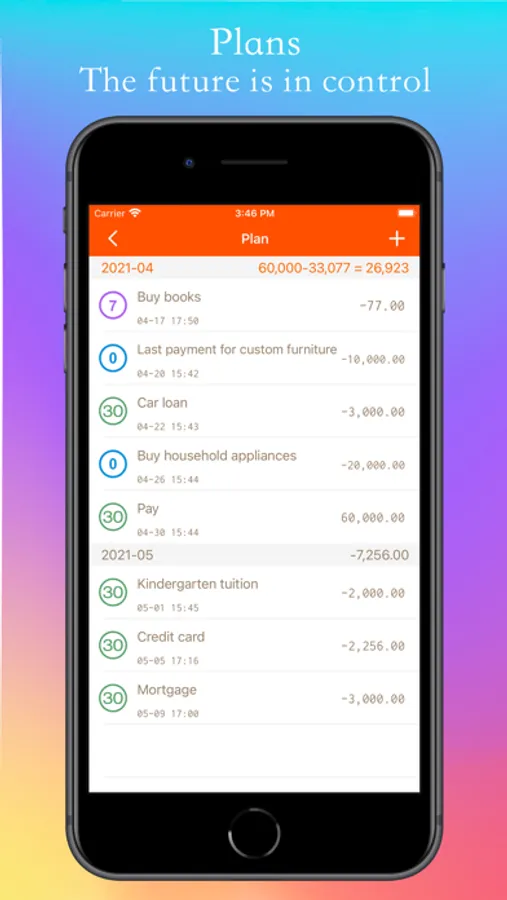 * Plan list: list the planned income and expenditure items and total amount by month, reminder of due message, and automatic accounting. The future is in control!