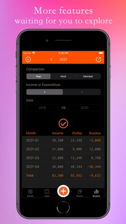 * Search: Keyword search for remarks, classification, membership and amount, and various search conditions can be set to filter search results. You can also search to calculate the balance of income and expenditure.