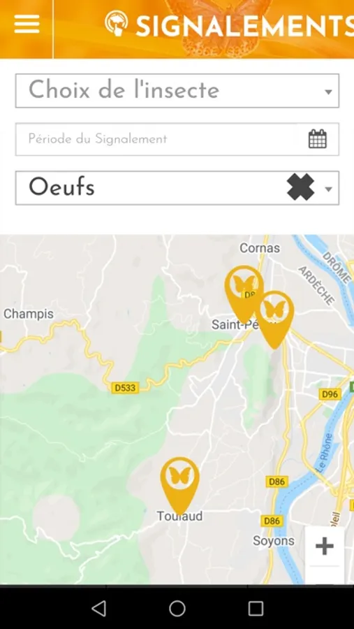 Vous pourrez ensuite suivre la propagation des attaques des insectes avec la cartographie qui s’auto-alimentera. Vous pourrez également rechercher l’historique des infestations grâce à la cartographie interactive (choix des dates et des insectes observés).