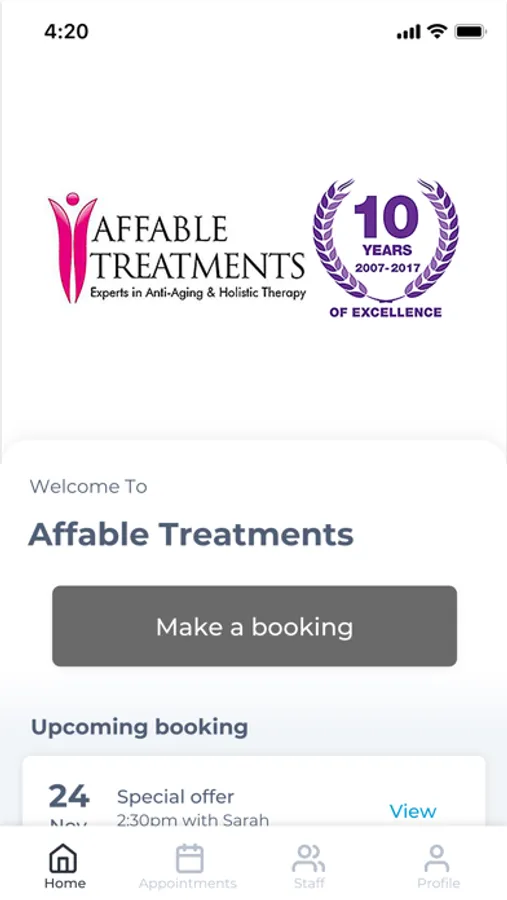 The Affable Treatments app makes booking your appointments and managing your loyalty points even easier. You're just a few taps away from feeling good and looking great!