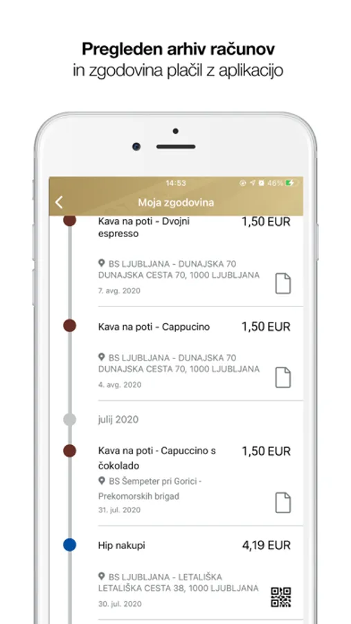 - Pregledno in transparentno plačevanje z zgodovino preteklih transakcij z aplikacijo ter arhiv računov.