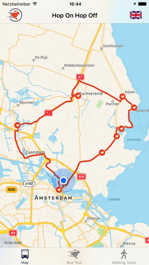 The stops include: Broek in Waterland, Monnickendam, Cheese Farm Jacobshoeve, Volendam, Edam, Purmerend, and Zaanse Schans.