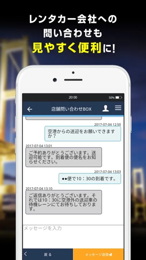 レンタカー店舗にお問い合わせができる機能に、チャット方式の画面を取り入れました。