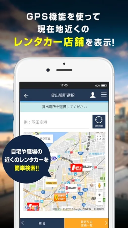 「地図から検索」の機能でGPSを使って最寄のレンタカー店を探すことができます。