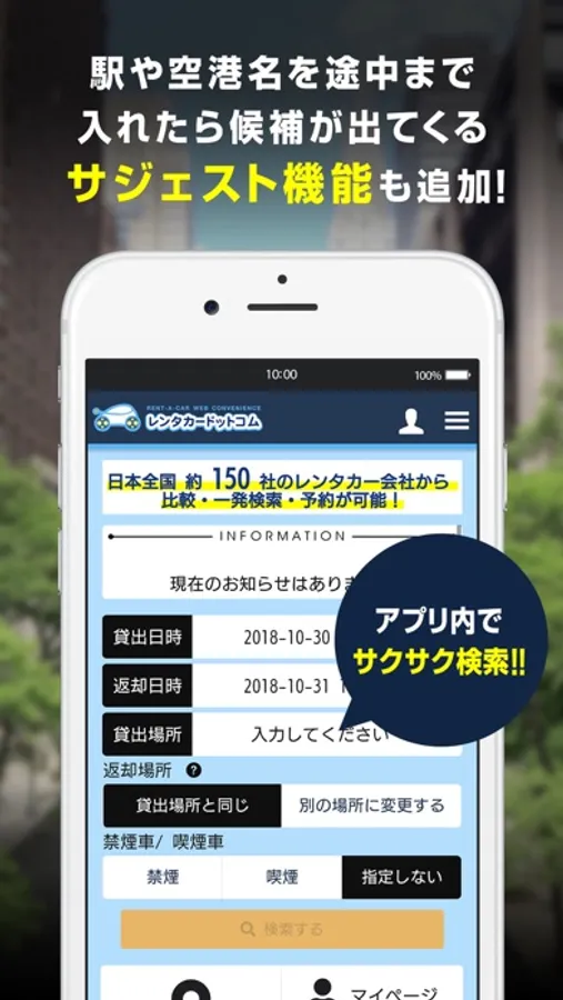 レンタルを希望の駅や空港名を途中まで入れると、候補名を出してくれるサジェスト機能を導入。