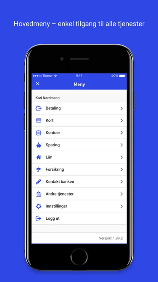 Hovedmeny finner du øverst i venstre hjørne. Her har du tilgang til de fleste tjenestene i mobilbanken.