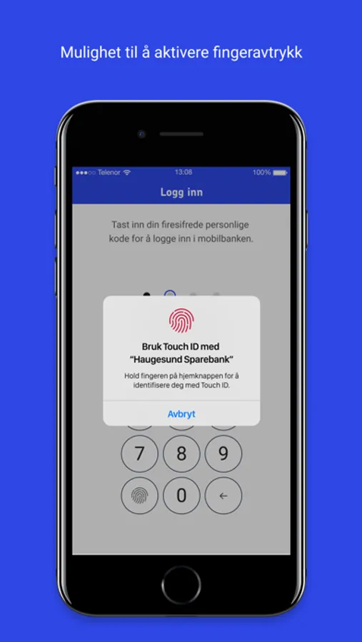 Du logger inn i mobilbanken med fingeravtrykk eller den personlige 4-sifrede koden som du valgte under aktiveringen.