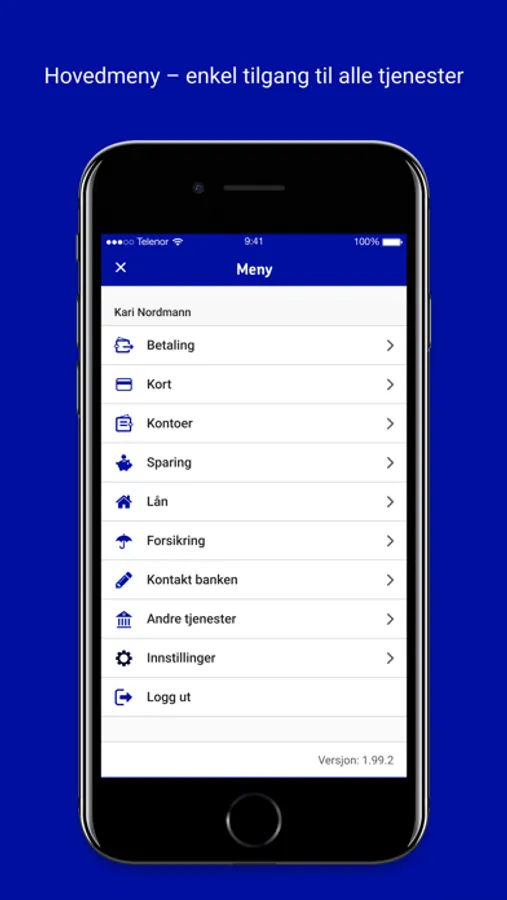 Hovedmeny finner du øverst i venstre hjørne. Her har du tilgang til de fleste tjenestene i mobilbanken.