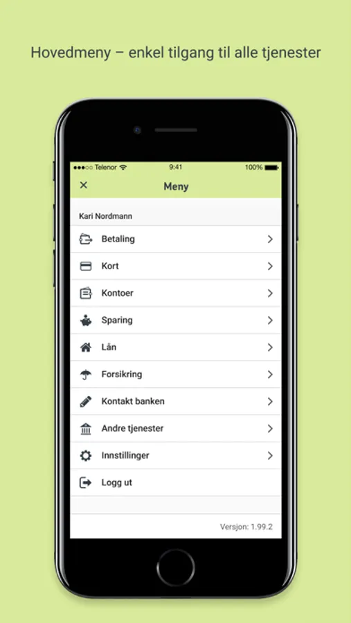 Hovedmeny finner du øverst i venstre hjørne. Her har du tilgang til de fleste tjenestene i mobilbanken.