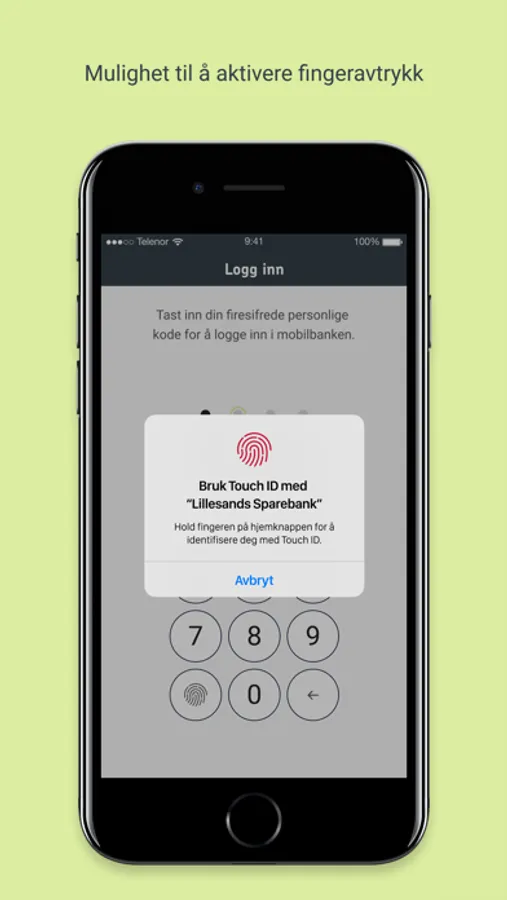 Du logger inn i mobilbanken med fingeravtrykk eller den personlige 4-sifrede koden som du valgte under aktiveringen.