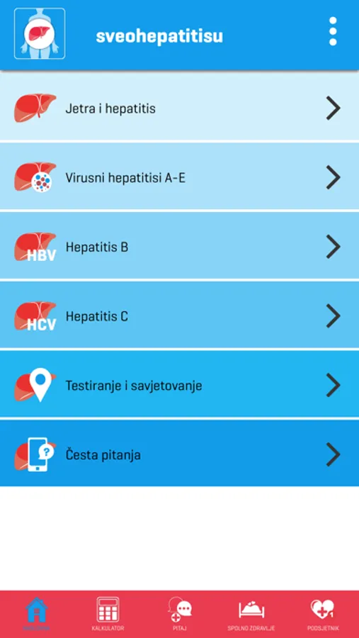 „Sve o hepatitisu“ je besplatna, sveobuhvatna, korisna i interaktivna hepatitis platforma i aplikacija izrađena u informativne i obrazovne svrhe, s ciljem poboljšanja hepatitis informiranosti i razumijevanja važnosti odgovornog ponašanja, zdravog stila života i zaštite od virusnih hepatitisa u cilju očuvanja i unapređenja zdravlja.