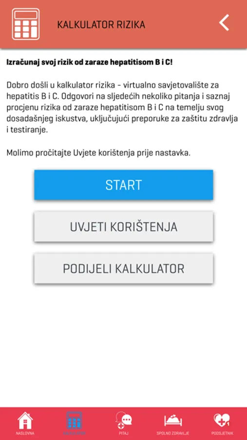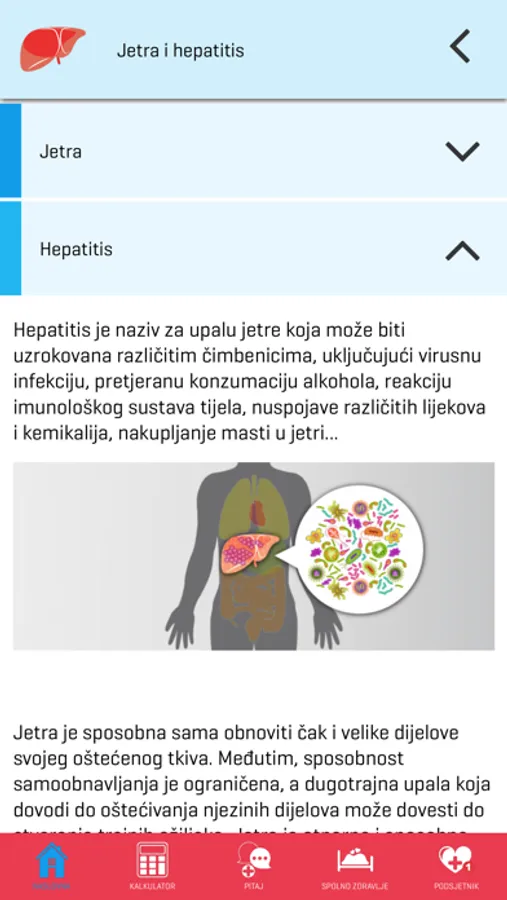 Aplikacija na jednostavan način pruža korisne i interaktivne usluge Kalkulatora rizika za informativan izračun procjene rizika od zaraze hepatitisom B i C, mogućnost postavljanja pitanja stručnjaku te Podsjetnik za jednostavno planiranje redovitog uzimanja lijekova ili bilo kojeg drugog zadatka ukoliko je to važno za Vaše zdravlje, liječenje i izlječenje.