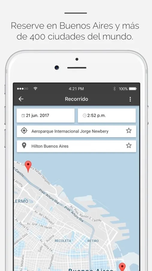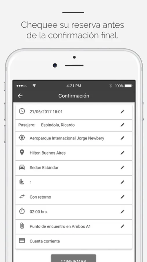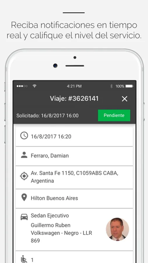 Abra la Aplicación, coloque fecha y hora de su viaje, cantidad de personas, maletas, tiempo de espera y solicite el vehículo. Recibirá una notificación cuando el mismo este en puerta, a la espera.