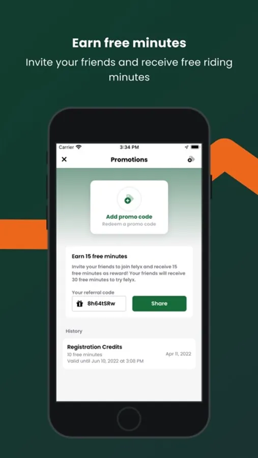 • €15 Free: Invite your friends to use felyx and receive €15 free for your next rides. You'll get a €3 discount on each of your next 5 rides just by sharing your personal code. To both enjoy this benefit, the person you invited must also take a ride on our e-mopeds, before you receive the same reward. You have 30 days to use it.