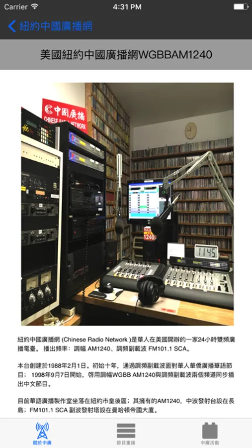 初始十年,通過調頻副載波面對華人華僑廣播華語節目;1998年9月7日開始,啓用調幅WGBB AM1240與調頻副載波幷播,同時增辦外語廣播節目。