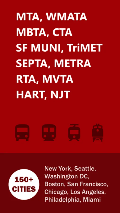 Over 150+ supported cities including Chicago, Boston, New York - NYC, SF Bay Area, Portland, Los Angeles, Washington DC, Seattle, Toronto (TTC) and many more coming soon. Never miss public transport in your city again.