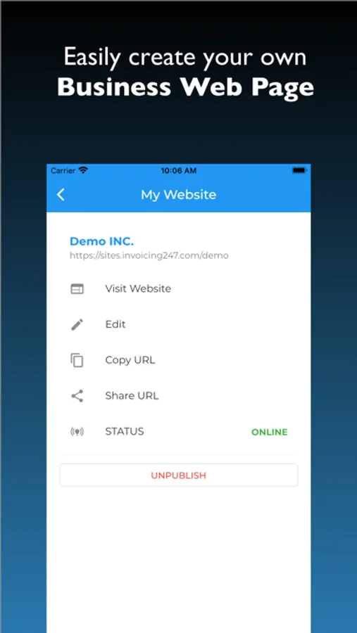Reach more clients by creating your own business web page from right within the app! Simply fill in a few fields, and the app will create a web URL where users can visit your page and browse your list of services or products.