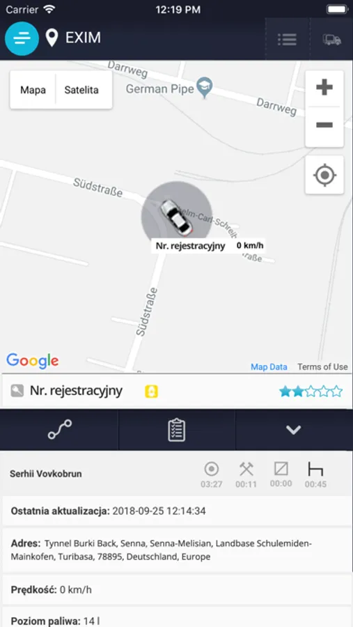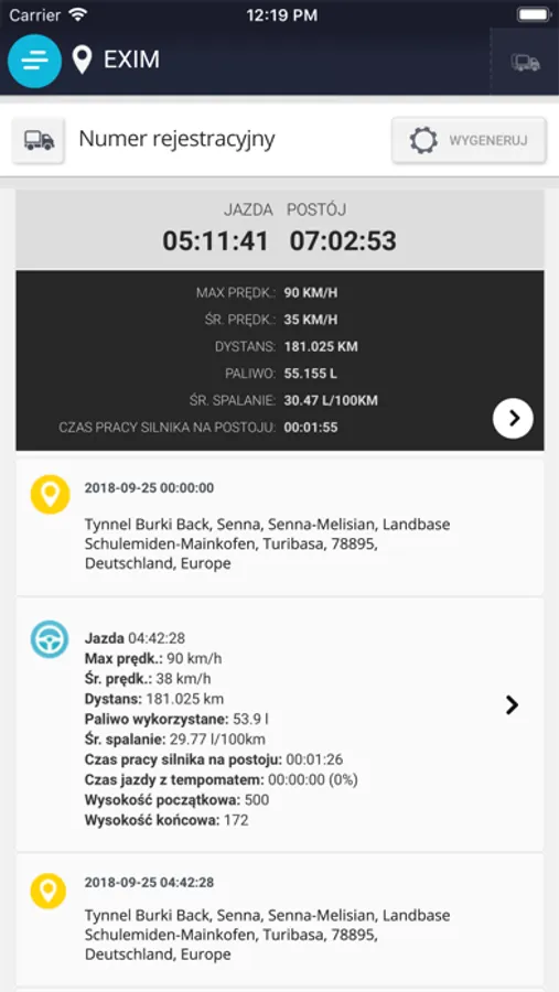 - parametry eksploatacyjne (m.in. prędkość, przebiegi, obroty silnika, informacje paliwowe, czas jazdy i postoju),