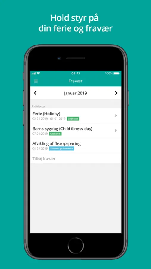 Her er det muligt at tilføje og anmode om fravær direkte i appen. Du får nemt et overblik over dit fravær og har mulighed for at administrere det.