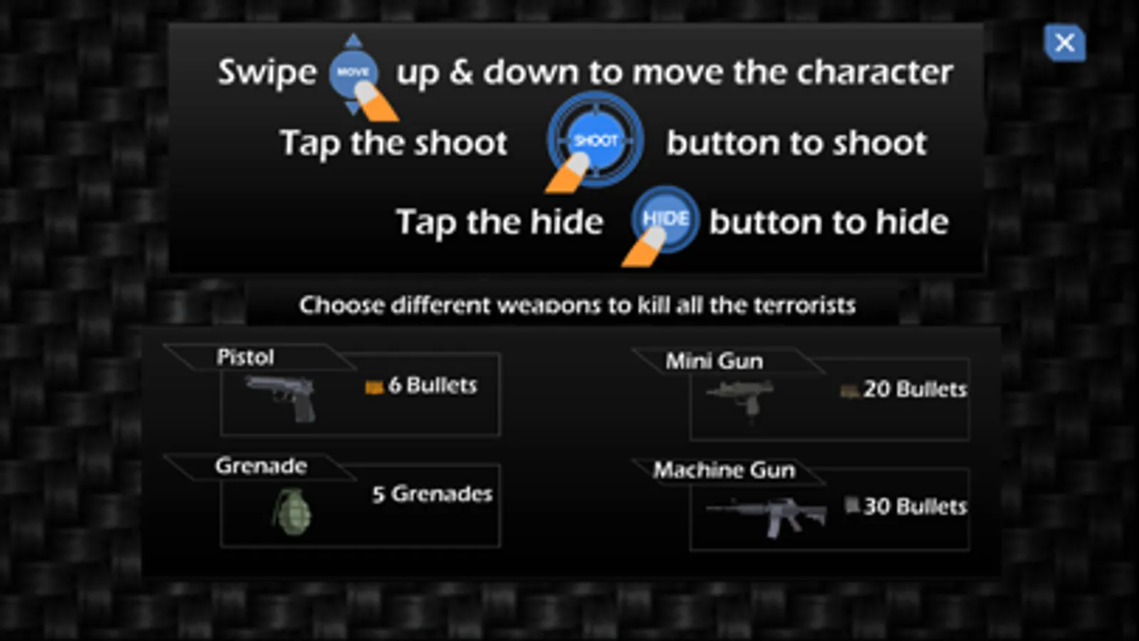 Complete the level by avoiding getting shot and completing objectives in the given time. Arm yourself with weapons and bullets to fight hoards of terrorists. Utilize the grenades for maximum area of effect damage. Take advantage of the upgrades during gameplay to match up to tougher opponents.