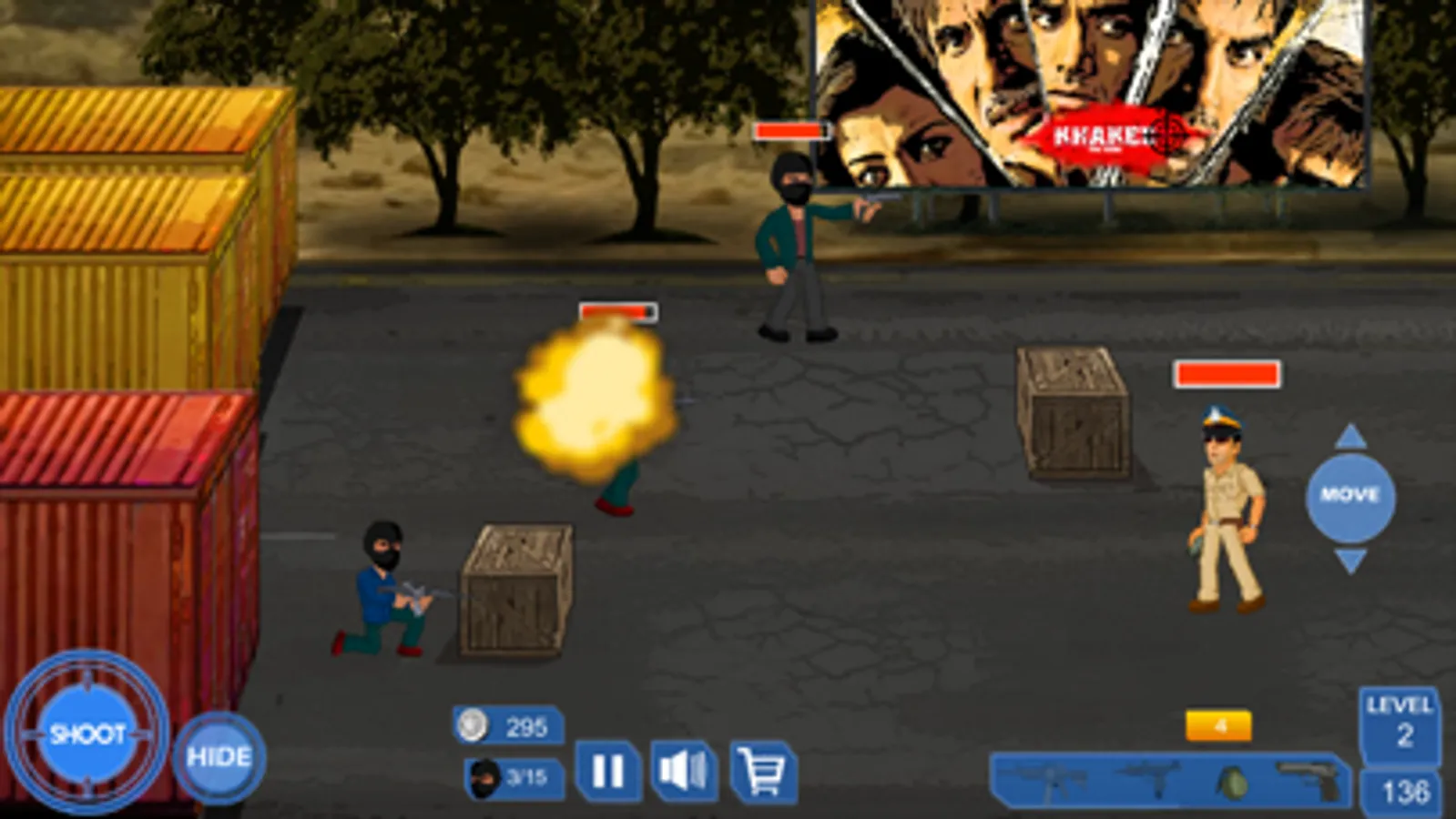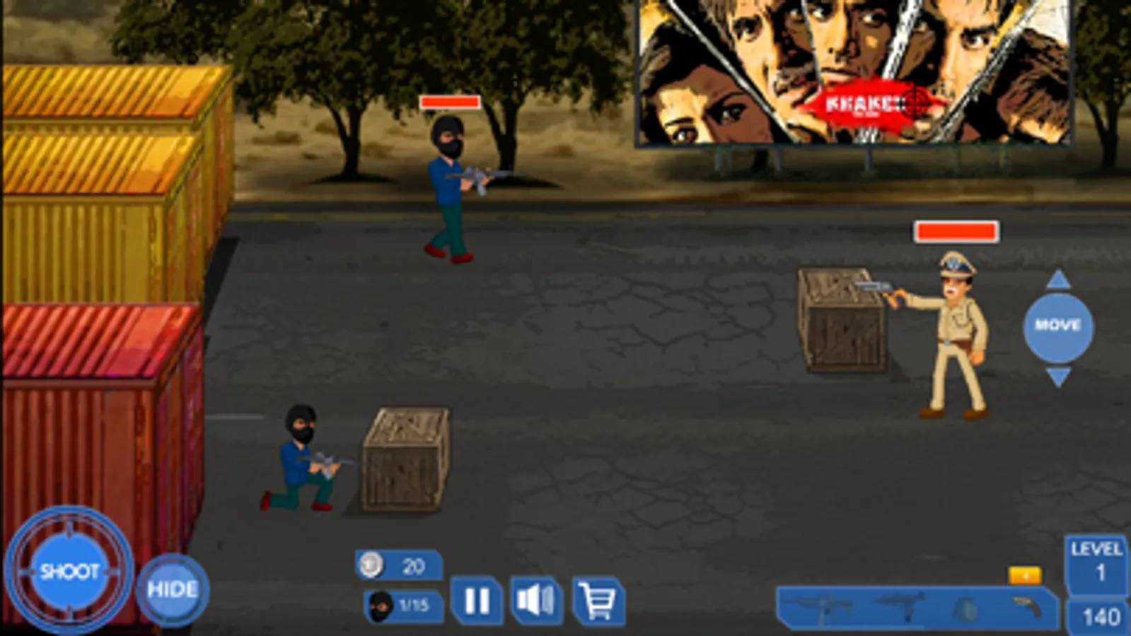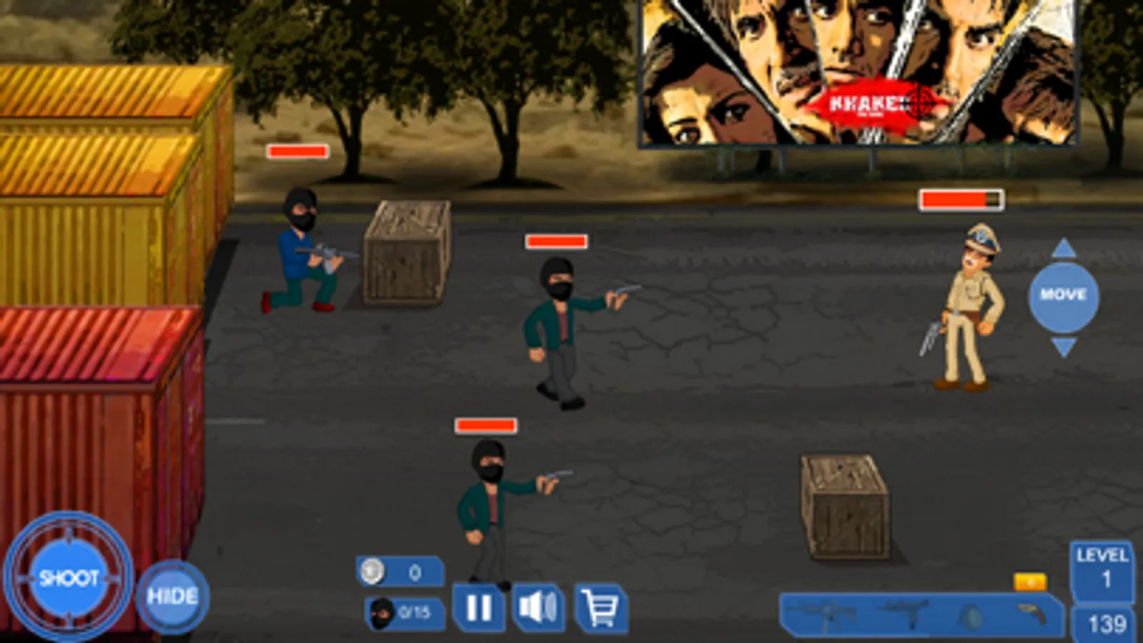 Khakee is an action packed Side Shooter Game which follows the storyline of the movie.DCP Anant Shrivastav (Amitabh Bachchan), along with his team Shekhar Verma (Akshay Kumar) and Ashwin Gupte (Tusshar Kapoor), have been assigned to escort a dangerous terrorist Iqbal from Chandangarh to Mumbai. But there is an unseen enemy who does not want this group to reach Mumbai. Help them defeat the enemy and serve justice!