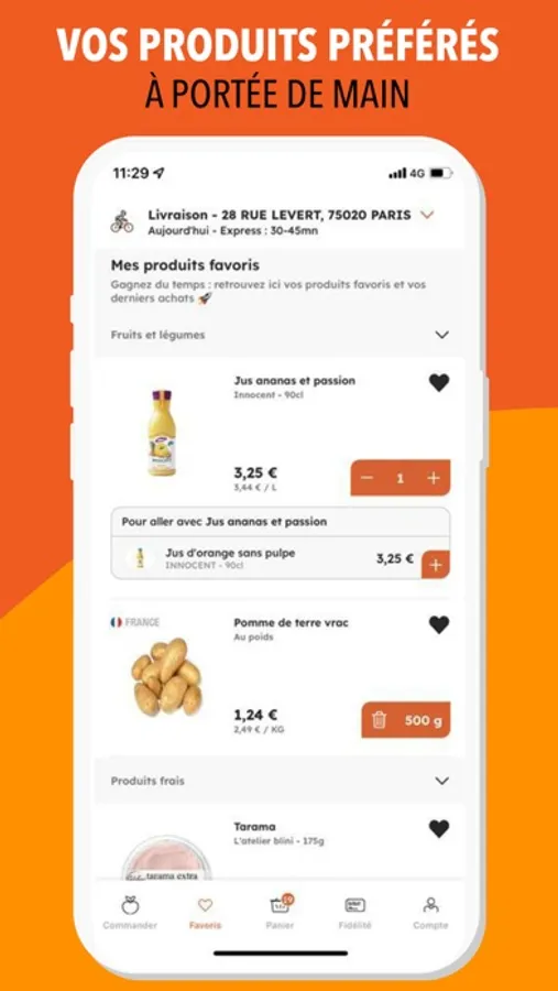 • Retrouvez dans l'onglet "Favoris", vos derniers achats à portée de clics.