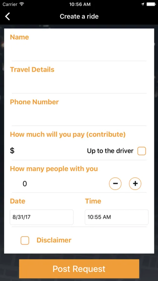 You can view passenger details on the "view riders" page. It will show you where they are, where they need to go, how many passengers and how much they are willing to pay(contribute)for the ride. If you are going their way and want to pick them up, simply click on call or text and communicate directly with your passenger. your ride request will automatically time out after approximately 60 min if you choose not to delete.