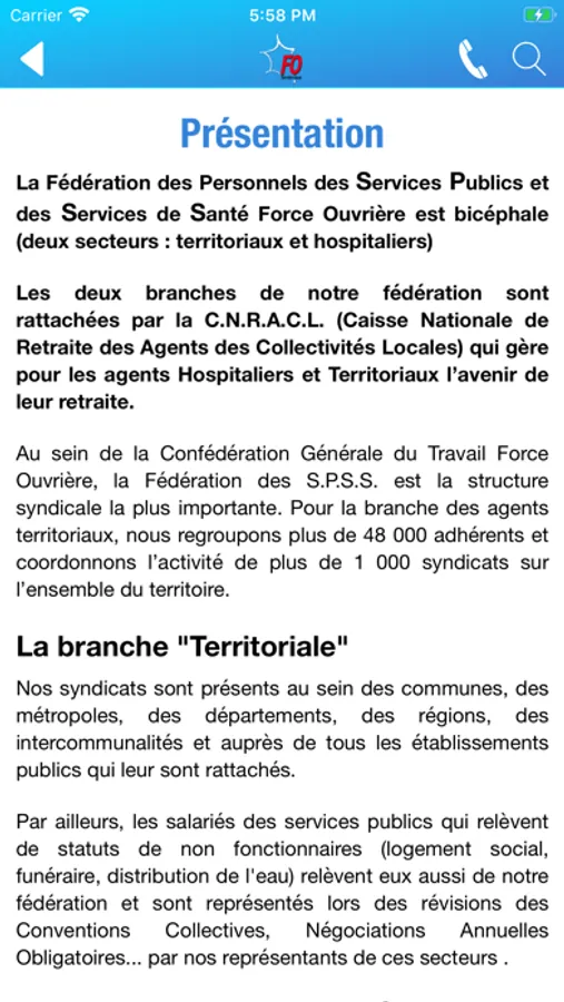La Fédération FORCE OUVRIÈRE des Services Publics a souhaité se doter d’une application lisible, conviviale et simple d’utilisation, afin de permettre à tout agent syndiqué ou sympathisant, de pouvoir accéder en temps réel aux informations importantes de l’actualité dans la Fonction Publique Territoriale, et aux positions tenues par notre organisation syndicale.