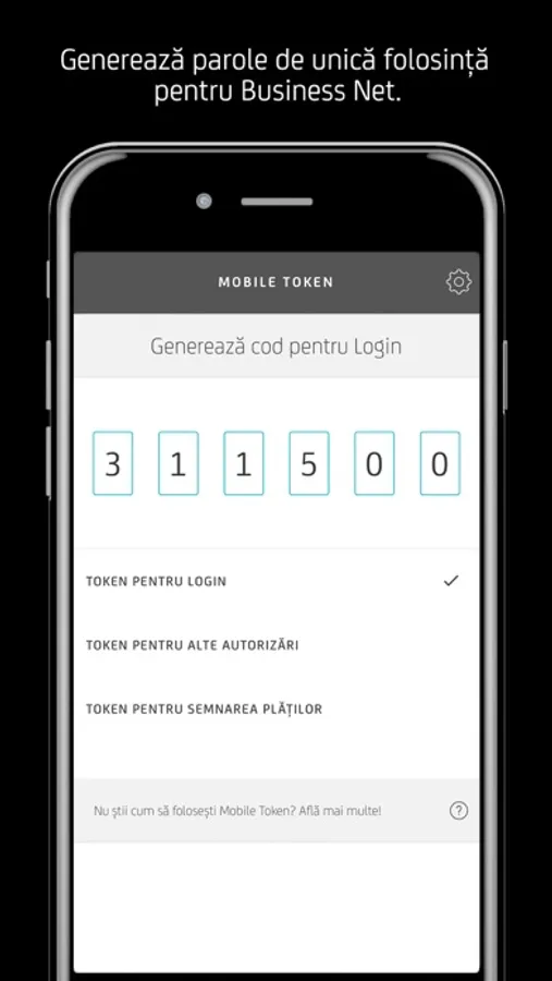 Activeaza Mobile Token. Aplicatia genereaza coduri de unica folosinta pentru autentificarea si autorizarea tranzactiilor bancare pe care le realizezi in BusinessNet. Autentificarea in aplicatie se poate face si prin scanarea amprentei digitale sau faciale, daca telefonul permite aceasta optiune.